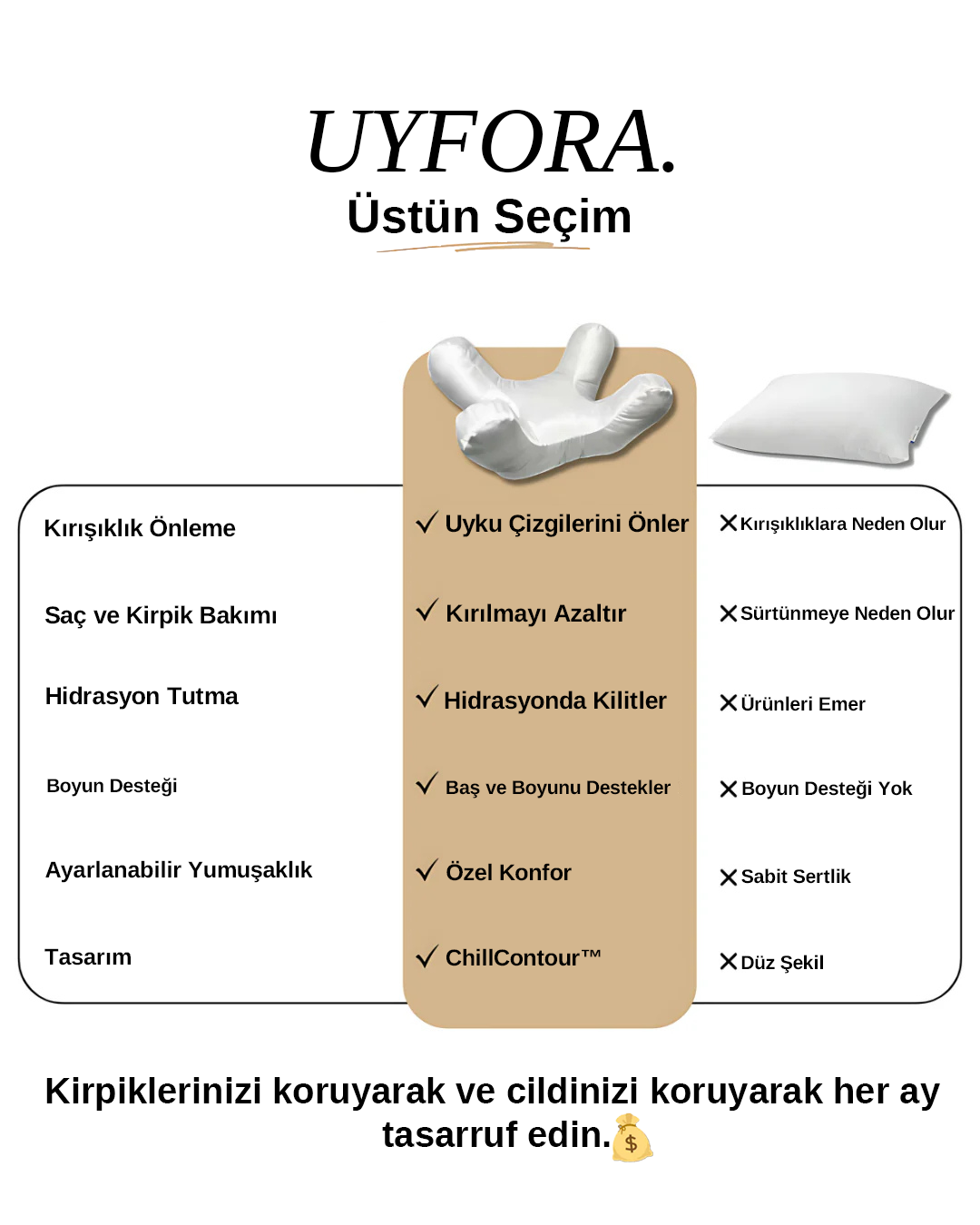 Fark: Normal yastıklar, yer çekimine ek olarak bir de sıkıştırma etkisi yaratarak kırışıklıklara ve şişkinliğe neden olur. NapBae ise yüzünüz normal pozisyonunda dinlenirken bu zararlı sıkıştırmayı ortadan kaldırır.